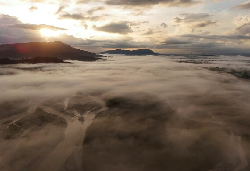Вид с высоты на реку Агуарико, которая протекает через территорию коренных народов Ай Кофан, Эквадор