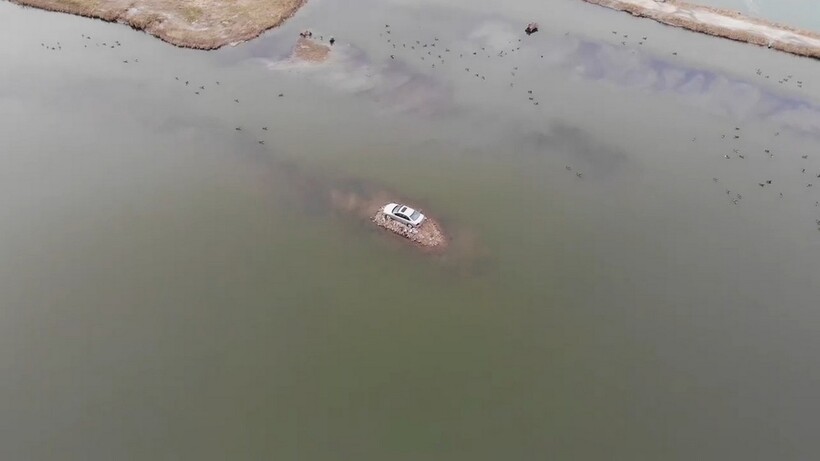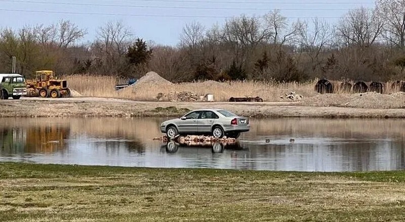 Сначала он поставил седан на небольшой полуостров, который вдавался в воду. Затем с помощью экскаватора убрал всю землю вокруг машины, оставив лишь крошечный островок размером с сам автомобиль. Получилось идеально: машина стояла посреди глубокого озера, и никто не мог понять, как она туда попала.