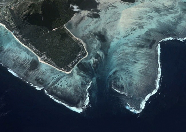 Эту иллюзию создают песчаные отложения, простирающиеся вдоль побережья острова Маврикий. Создается впечатление, что под водой находится огромный водопад.