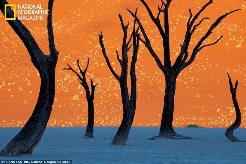 Нет, это не картина, нарисованная художником-экспрессионистом. На переднем плане мертвые деревья, которые затмевает заходящее солнце, а на заднем плане красные дюны Намибии. Но свет и тени создают впечатление чего-то ненастоящего.