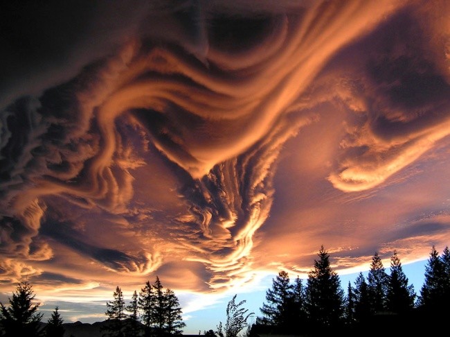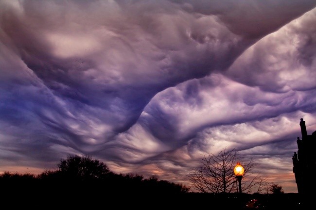 Глядя на такие облака, кажется, что вместо неба — бушующий океан. Undulatus asperatus — редкий тип облаков, имеющий необычный и устрашающий вид. Несмотря на грозный вид, облака асператус не сопровождаются ураганом или грозой.