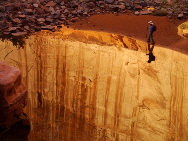 Кажется, что человек идет по краю обрыва, но на самом деле он идет по берегу реки, находящейся внутри Глен-Каньона.