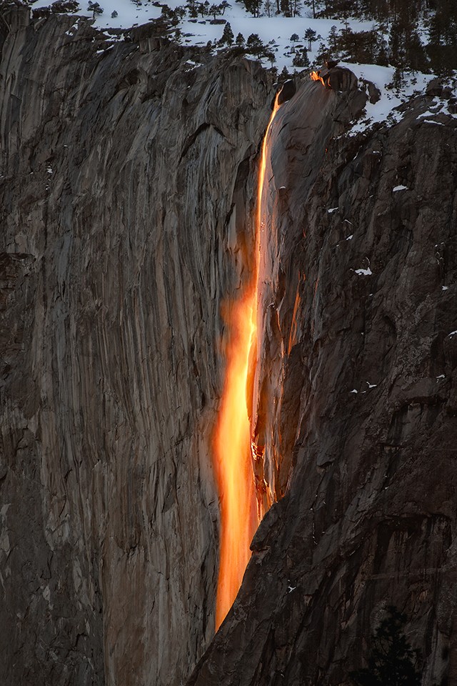 Водопад Хорстейл почти в полтора километра высотой располагается в национальном парке Йосемити в Калифорнии. Когда на него смотришь издали, кажется, что расплавленная лава падает с гранитной скалы вниз. На самом деле Хорстейл — обычный водопад, который становится «огненным» из-за лучей солнца, подсвечивающих под определенным углом гранитную скалу и отражающихся в воде водопада. Это явление можно наблюдать всего пару дней в году в конце февраля.
