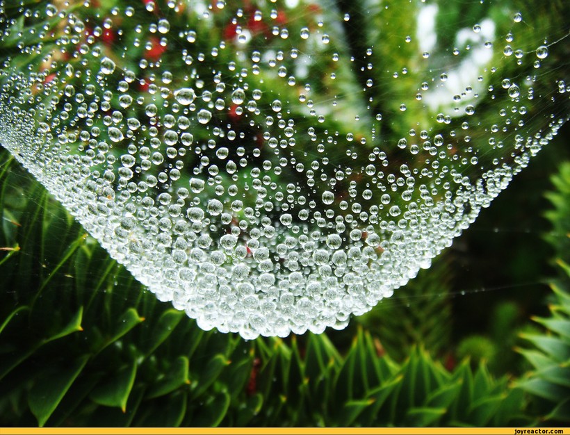 Это изображение выглядит как удачный фотоснимок дождя. Но если вы присмотритесь, то увидите, что каждая из этих капель просто повисла на паутине.