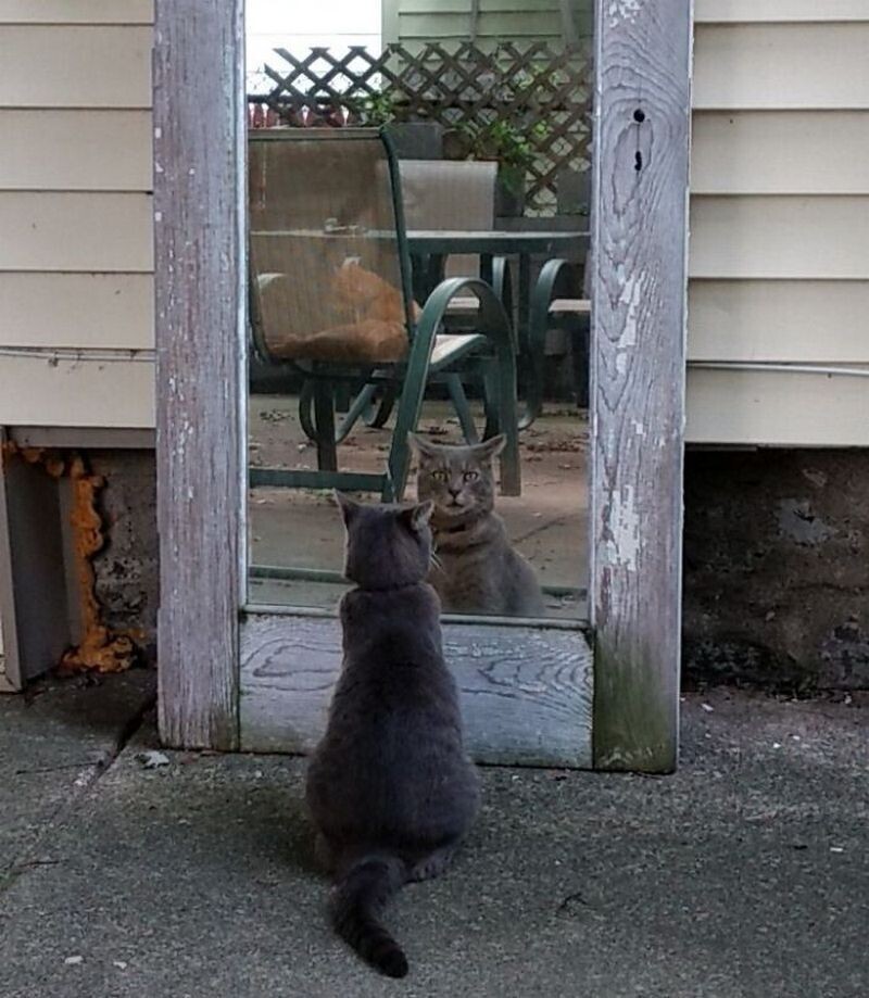 Кот наелся кошачьей мяты, увидел свое отражение и, кажется, осознал, что он кот