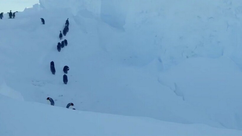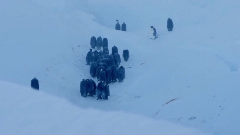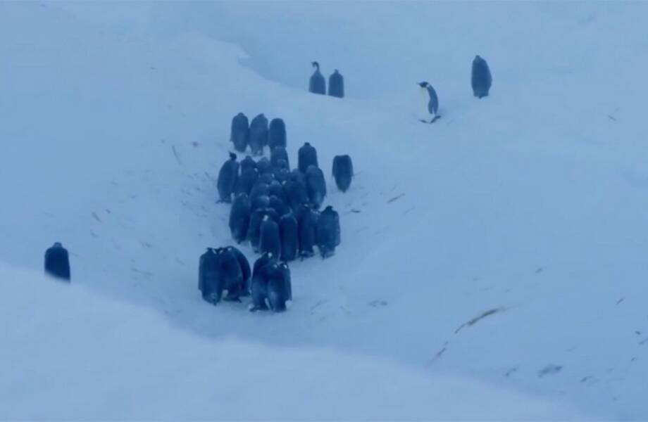 Съемочная группа BBC несколько лет назад наблюдала за небольшой колонией императорских пингвинов, которые пытались пережить суровую зиму. После мощного шторма ландшафт места съемок изменился: он загнал часть птиц в глубокий овраг с отвесными стенами. Пернатые не смогли выбраться из ледяной ловушки, ведь они просто не могли физически преодолеть крутые склоны.