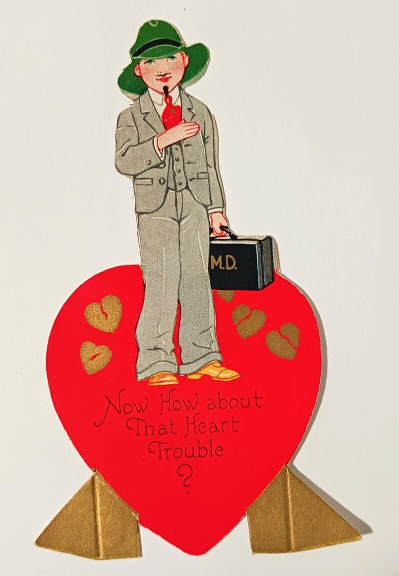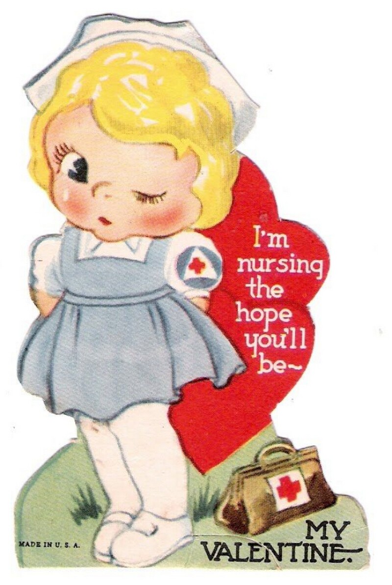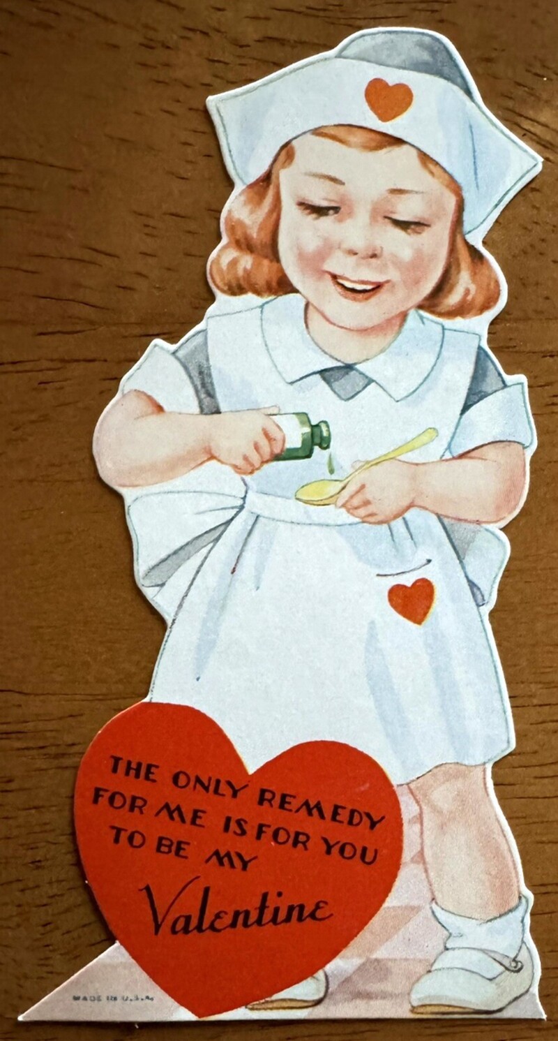 День святого Валентина в Америке и Европе отмечался еще в начале XX века, а открытки тогда были одним из главных способов выражения романтических чувств. Кстати, откуда вообще появился этот праздник, и как он связан с римскими вакханалиями, мы рассказывали в этом материале. В эпоху, когда прямые признания в любви считались слишком смелыми, валентинки позволяли передать послание с долей юмора и игривости. Особую популярность приобрели открытки с медицинской тематикой ― врачи и медсестры на них становились символами исцеления не только тела, но и сердца.
