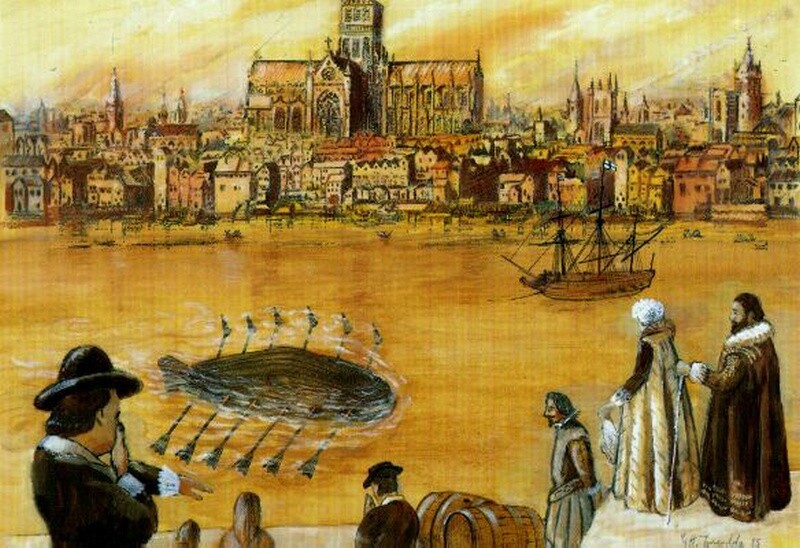 Внешне лодка была больше похожа на длинную шестиметровую бочку из дерева. Для надежности ее скрепляли железные обручи, а для герметичности обшили кожей. Пять членов экипажа приводили подводную лодку в движение с помощью весел. Погружался же корабль благодаря крошечным отверстиям, закрытым оловянными пластинами: через них вода наполняла кожаные мешки и медленно опускалась на дно. Чтобы подняться на поверхность, воду откачивали поршневым насосом.