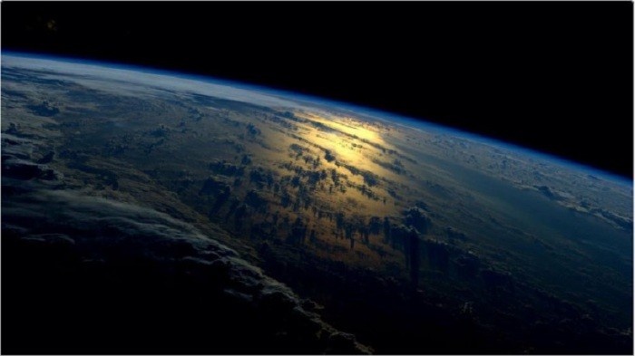 Отблески уходящего солнца на поверхности Земли отражаются золотым сиянием.