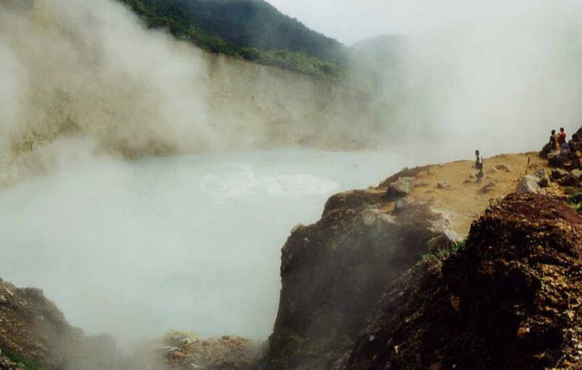 Над самим Кипящим озером находится облако густого белого пара, а вода в нем серо-голубого цвета. И вода в нем действительно закипает.