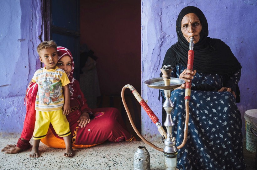 Пожилая женщина курит кальян в своем доме. Рядом — ее дочь и внук. Старые нубийские дома в Западном Асуане представляют собой большой открытый двор и примыкающие к нему жилые комнаты.
