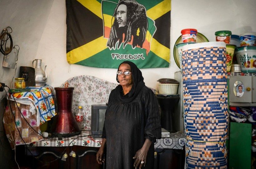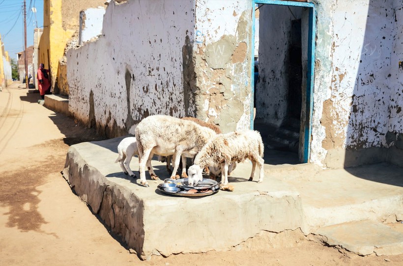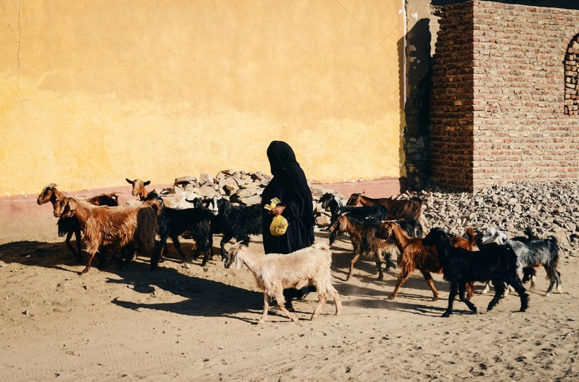 Старая нубийка отгоняет своих коз, чтобы освободить место для гостей, приезжающих на свадьбу.