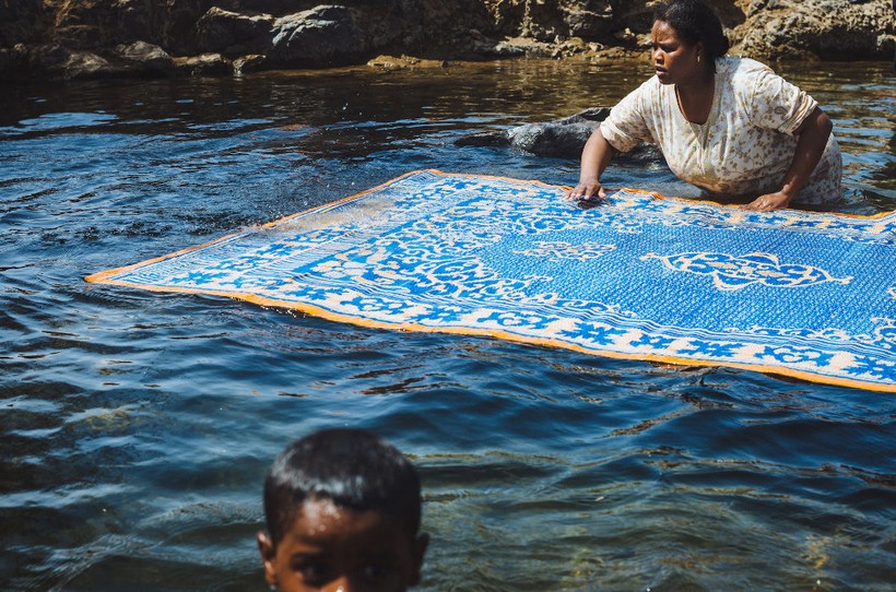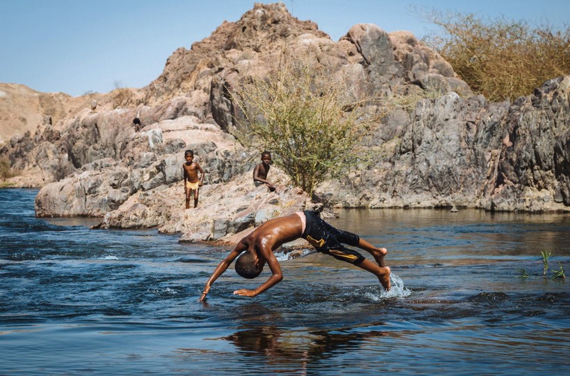 Нубийка чистит ковер в водах Нила в то время, как ее ребенок учится плавать.