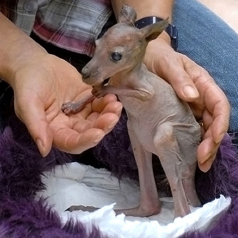 Детеныши кенгуру рождаются лысыми и обрастают шерстью, когда достаточно повзрослеют, чтобы покинуть материнскую сумку. Эта малышка по имени Сабрина была оставлена матерью и теперь вынуждена подрастать в одеяле или в объятиях добрых людей