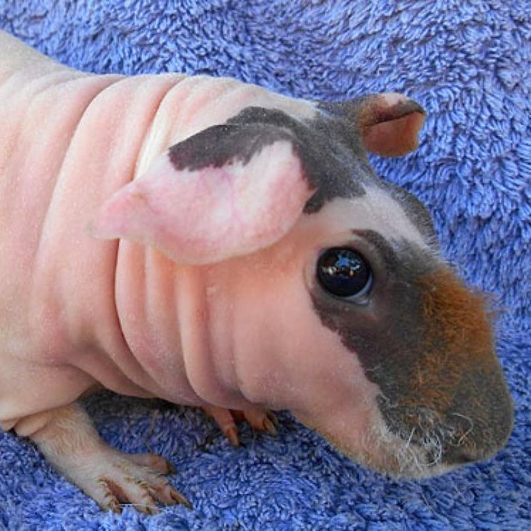 На фото голая морская свинка. В данном случае речь не идет о каком-то заболевании, животное лысое по своей природе и наверняка может стать любимицей эксцентричных дам