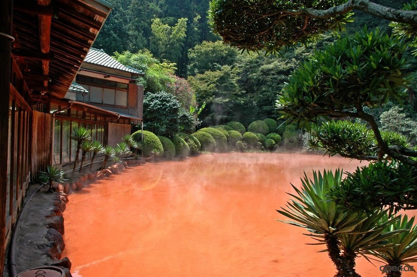 Находится пруд в Японии, это один из девяти известнейших источников-гейзеров Беппу. Конечно, Кровавый пруд самый популярный из них из-за своего цвета. Он ярко-красный, а вода в нем горячая. Точно адово пекло)