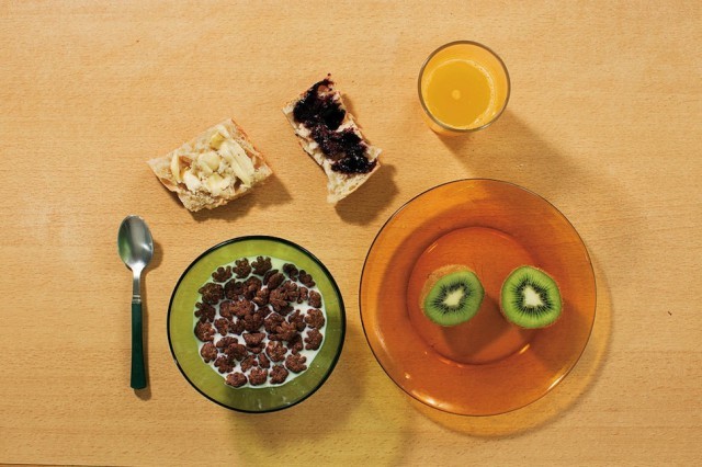 Меню: один киви, сэндвич, багет с маслом и джемом из черной смородины от бабушки с дедушкой, хлопья с холодным молоком, апельсиновый фреш.