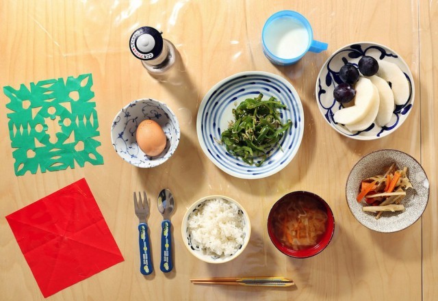 Меню: зеленый перец, обжаренный с маленькой сушеной рыбой, соевым соусом и семенами кунжута, горячий рис, политый сырым яйцом с соевым соусом, блюдо из лотоса и корней лопуха с морковью, обжаренной в кунжуте, масле, соевом соусе и сладком рисовом вине, мисо-суп, виноград, груша и молоко.