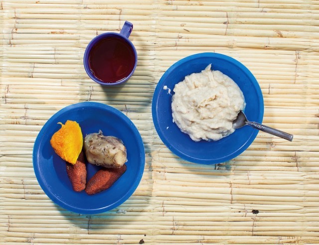 Меню: каша из кукурузной муки под названием пхала с соей и арахисовой мукой, оладьи из кукурузной муки во фритюре, лук, чеснок, чили, вареный сладкий картофель и тыква, красный сок из сушеных цветков гибискуса с сахаром.