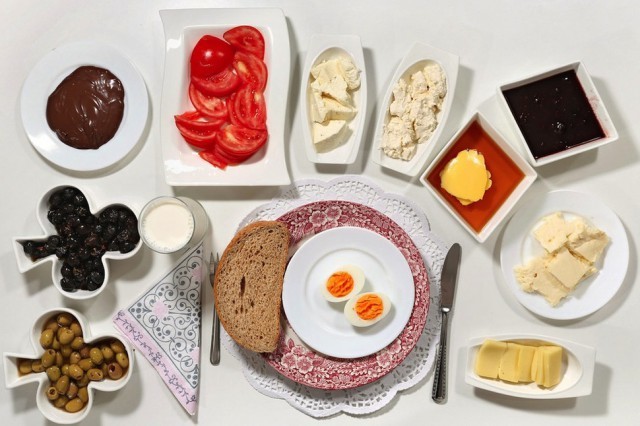 Меню: мёд и взбитые сливки под названием каймак на тосте, зелёные и черные оливки, яичница с пряными колбасками, масло, яйца, сваренные вкрутую, густой виноградный сироп с тахини, овечий, козий и коровий сыры, айва и ежевика, выпечка, помидоры, огурцы и белый редис, паста из красного перца, ореховая халва, молоко и апельсиновый сок.