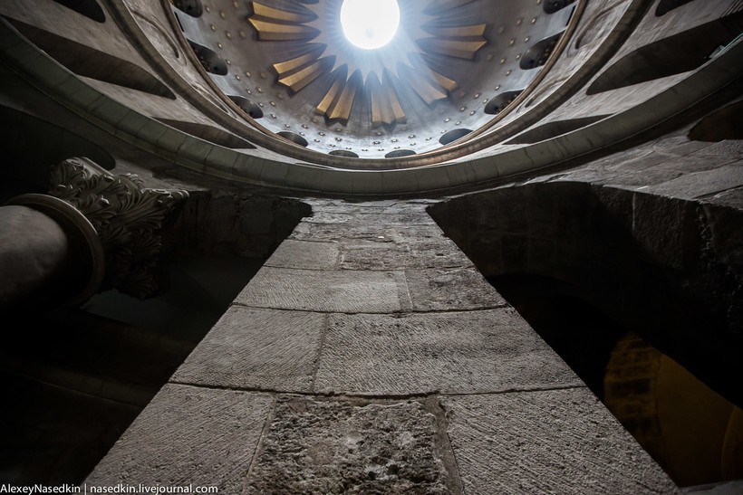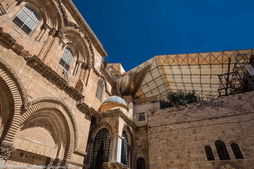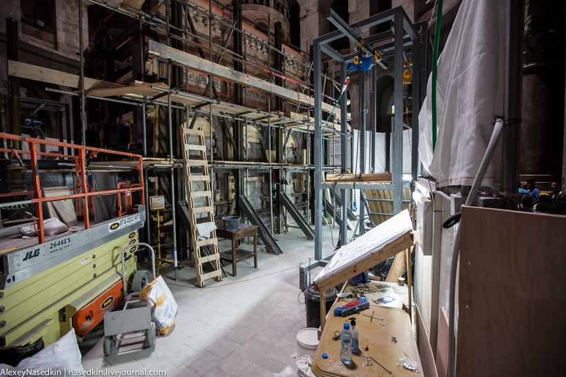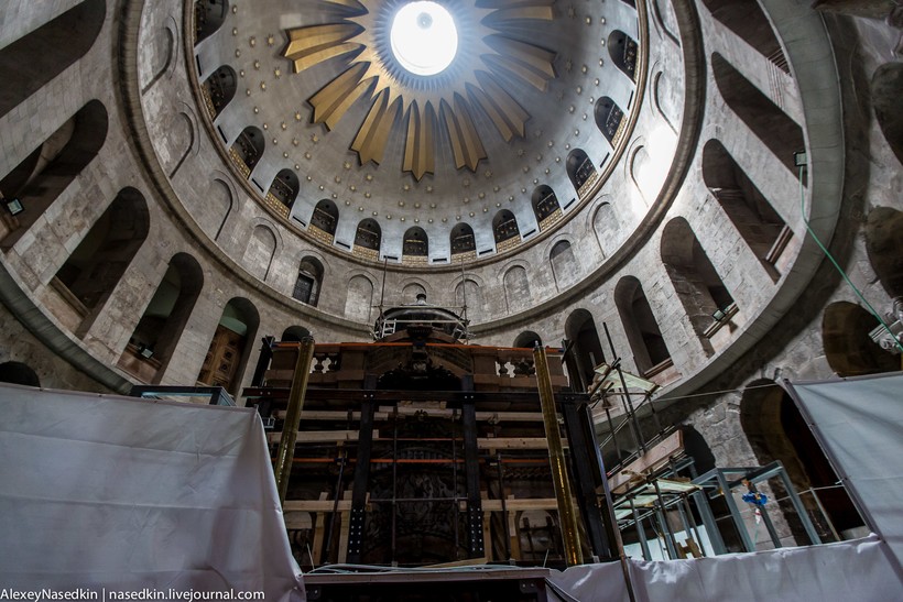 Как известно, под ротондой расположена Кувуклия — там, собственно, и находится сам Гроб Господень. В данный период вокруг Кувуклии проводятся ремонтные работы.