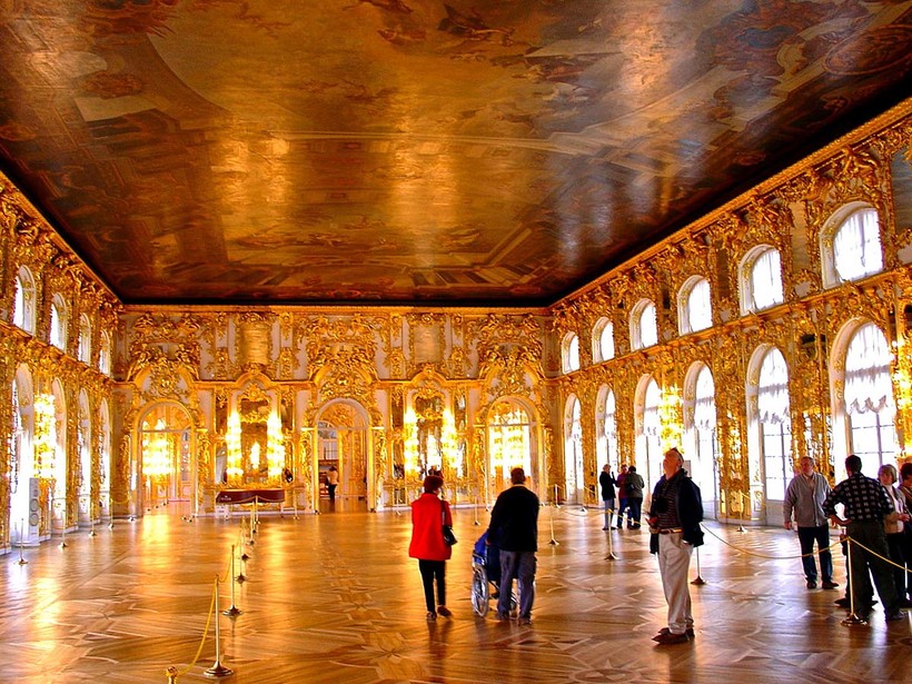 Ну и, конечно, здесь находится янтарная комната ― самая известная часть дворца. Ее подарил Петру Великому король Пруссии в 1716 году. На ее отделку ушло более 450 килограммов янтаря.