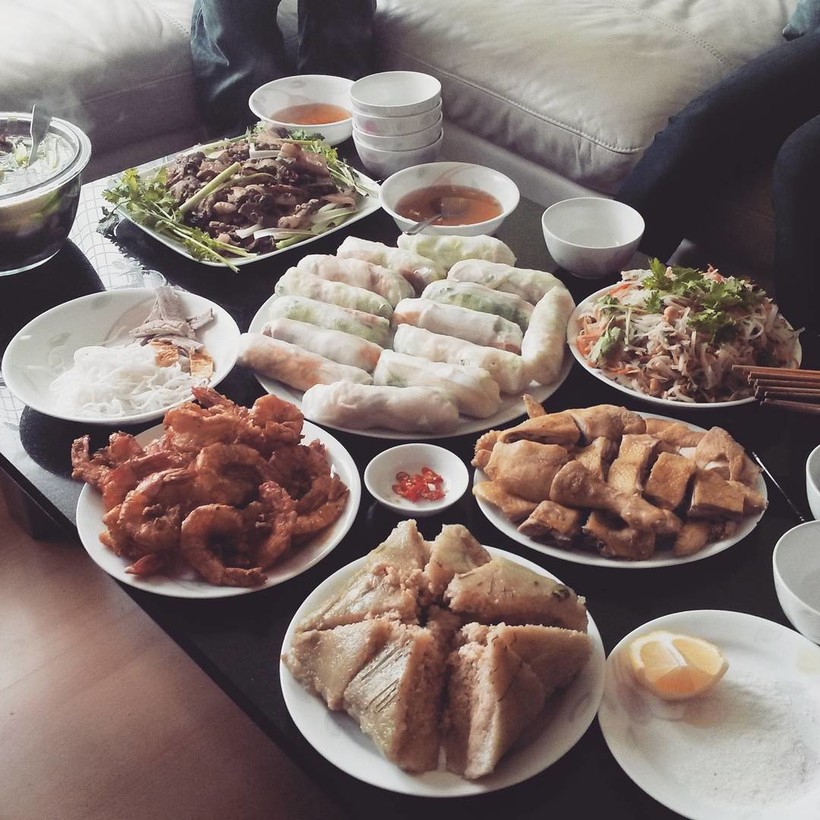 Во Вьетнаме праздничные блюда традиционно готовятся из риса и мяса. Например, свинина в кокосовом молоке или пирог бань чунг (в листья бамбука заворачивают смесь из риса и свинины и обжаривают).