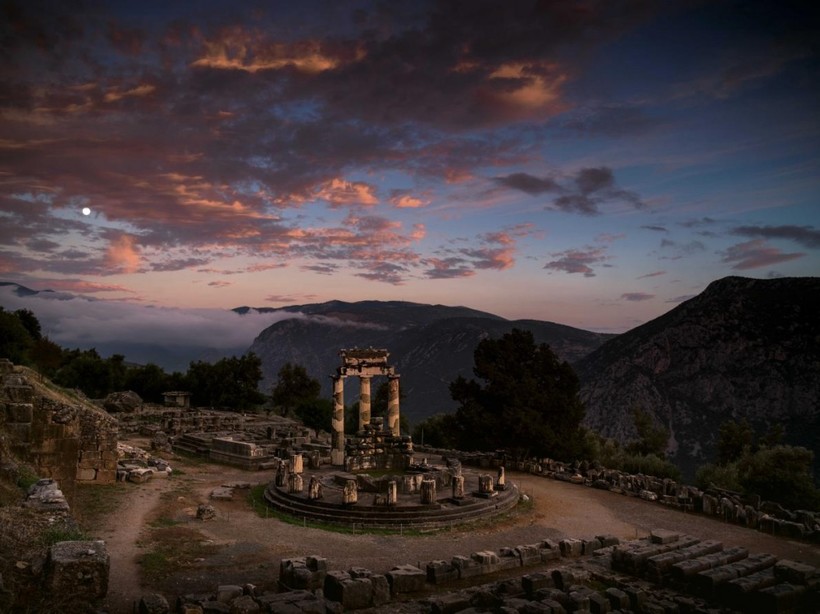 Храм Афины Пронайи в сумерках, Дельфы, Греция.