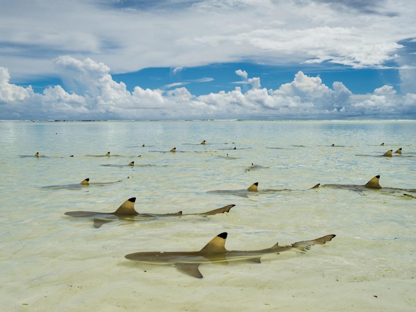 Акулы ждут прилива в лагуне атолла Альдабра, Сейшельские острова