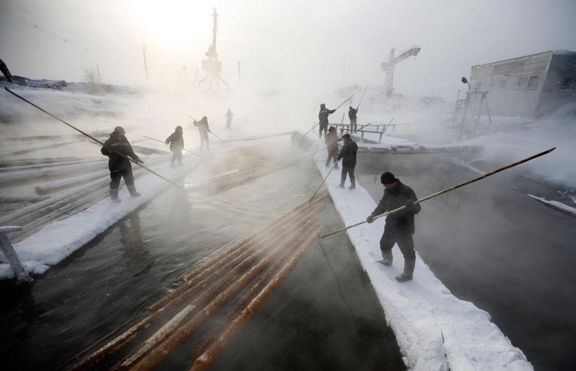 Профессия не из легких: переправить только что срубленный лес по течению реки.