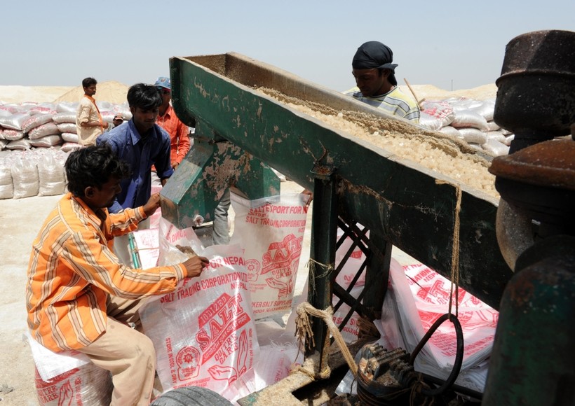 Индонезийские добытчики соли раскладывают кристаллы в упаковки.