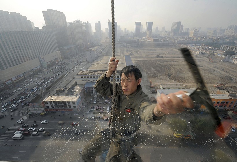Мойщик стекол очищает внешнюю сторону небоскреба одной рукой, а другой держится за трос-страховку.
