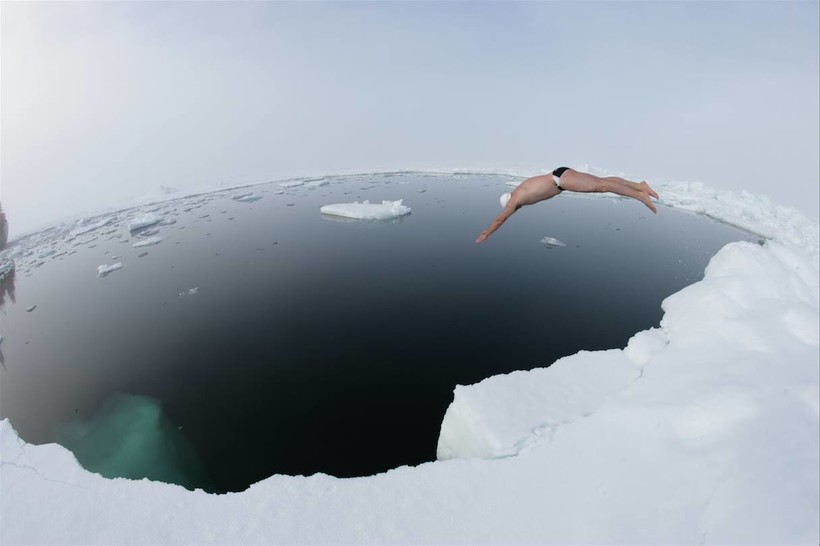 Но холодные моря покоряются людьми. Так, в воды Антарктики погружался английский пловец Льюис Пью. От этих фотографий даже кровь стынет в жилах:
