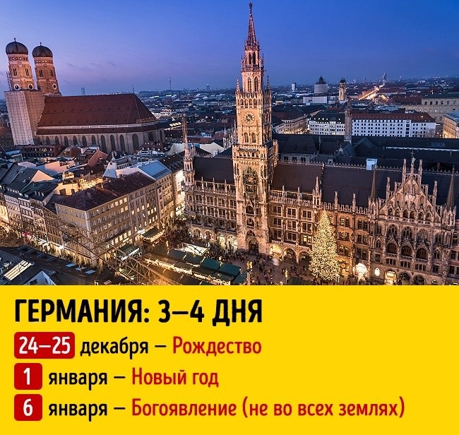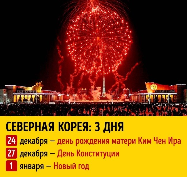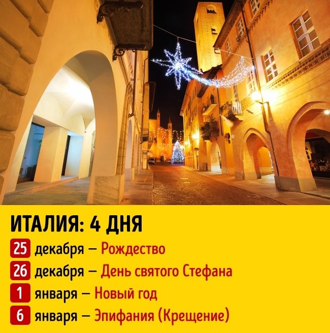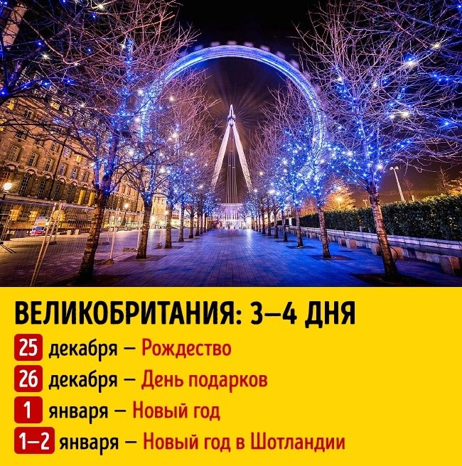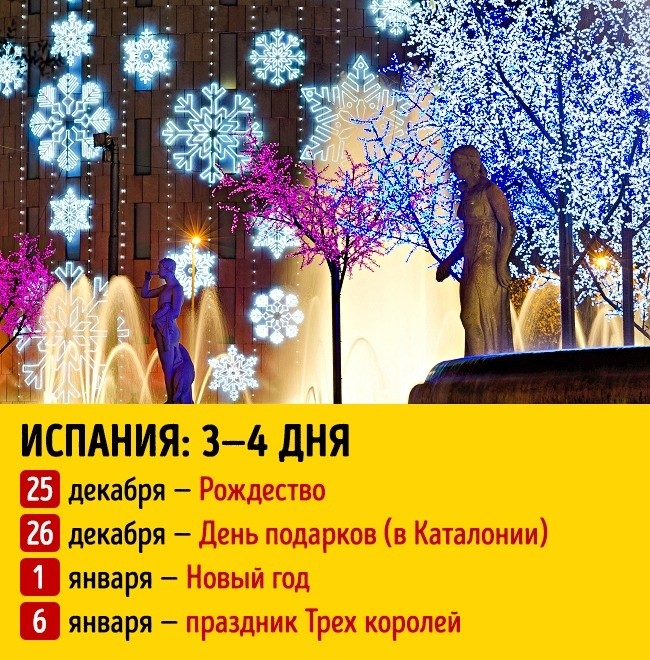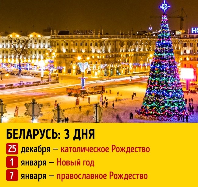 Иногда смотришь на какие-то факты, связанные с твоей родной страной и нарадоваться не можешь. Так случилось, например, когда мы узнали, сколько будут длиться новогодние каникулы в России, и решили, ради интереса, найти информацию о том, сколько отдыхают на Новый год и Рождество жители других стран. В общем, смотрите и не завидуйте!