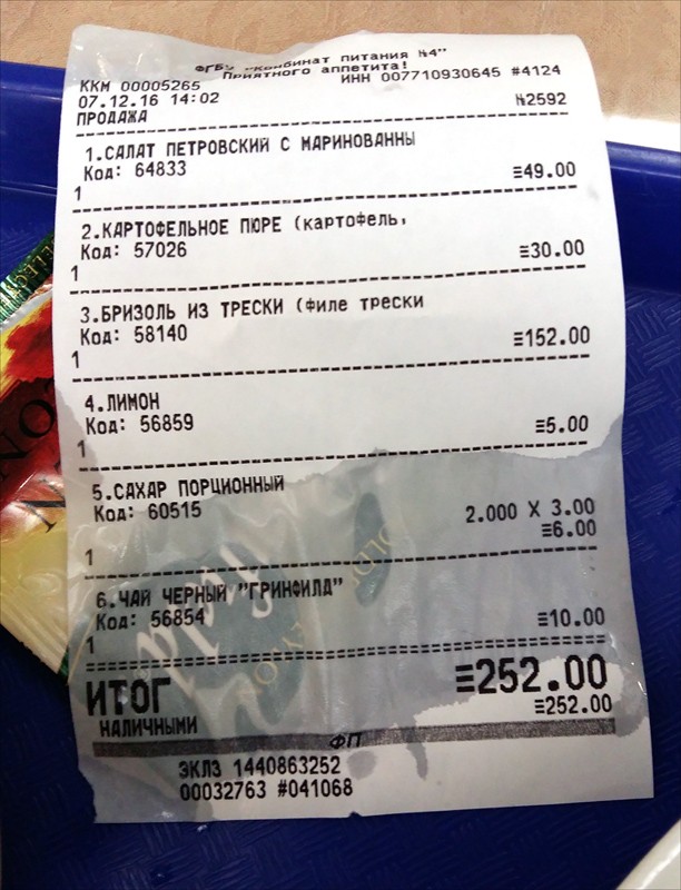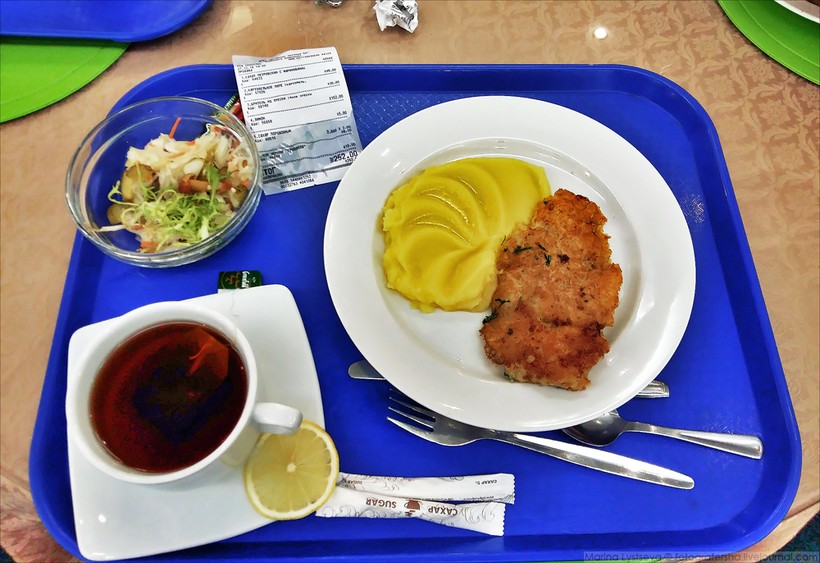 В салате с маринованными ингредиентами явно лишние свежие веточки, но это я придираюсь; пюре из нормальной картошки, лимон подсохший, треска — ничего нового. Да, и поднос потом на ленту не забыть поставить.