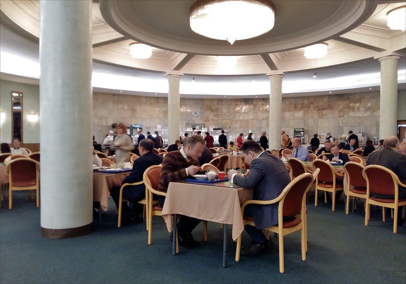 Переходим в «Зеленую» столовую. На дальнем плане стойки с едой и подносами — все, как в обычной столовой.