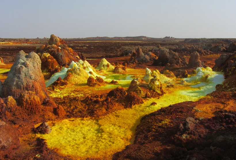 Хотите посетить Марс? Тогда вам в пустыню Данакиль, или, как ее еще называют, ад на Земле. Она находится в Африке, на севере Эфиопии. И знаете за что ее так прозвали? Дело в том, что воздух тут прогревается до 50, а иногда и 60 градусов, а земля ― до 70. А еще на территории пустыни много вулканов, периодически извергающихся прямо под ногами, поэтому здесь запросто можно сгореть, прогуливаясь по песку. Вулканы образуют расщелины, из которых вырываются ядовитые испарения. Кроме того, тут повсюду озера из серной кислоты и газа.