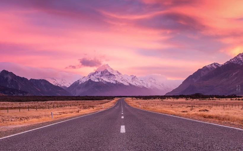 Асфальтовая дорога, которая ведет в национальный парк Маунт-Кук.