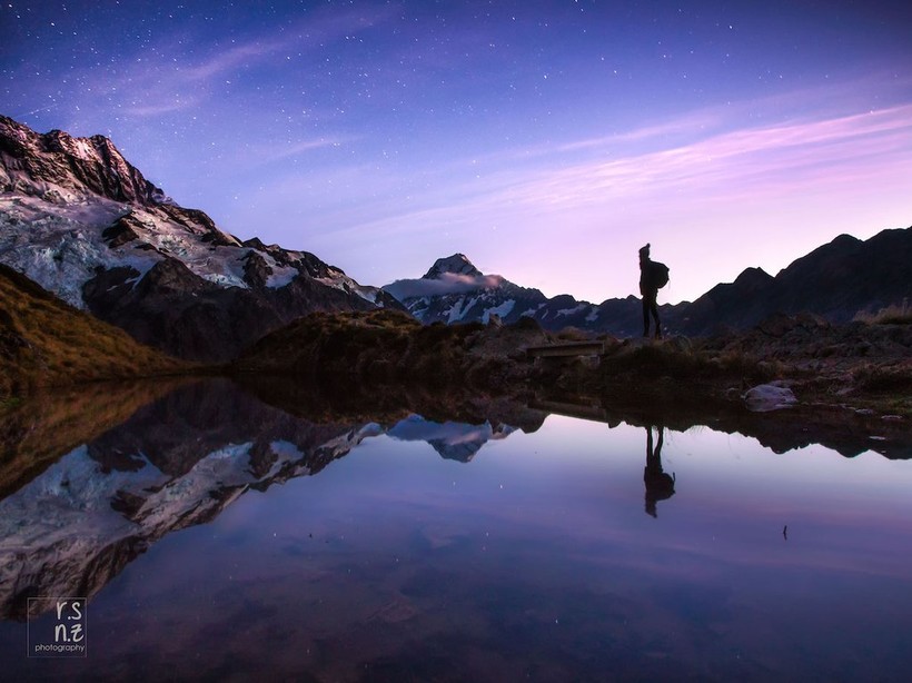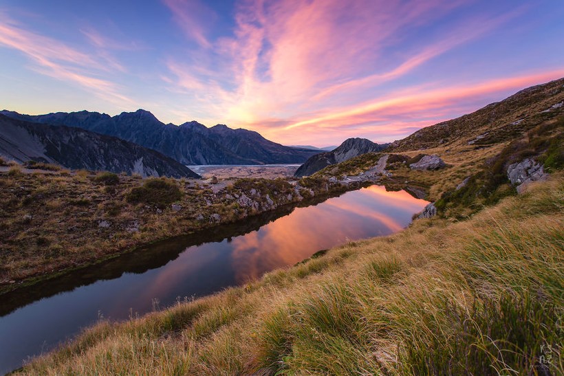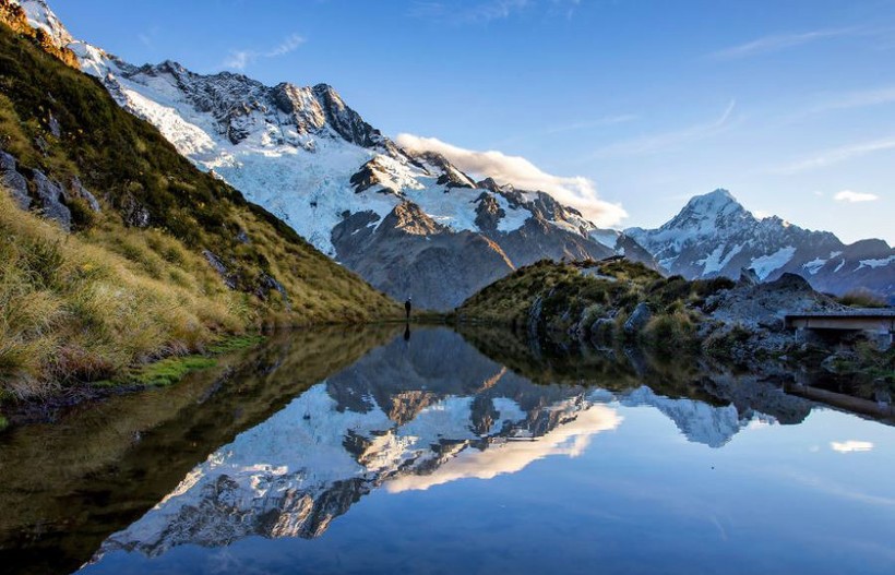 Национальный парк Маунт-Кук начинает свой новый день с первыми лучами восходящего солнца