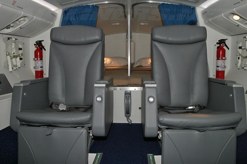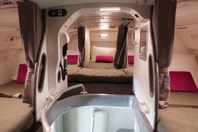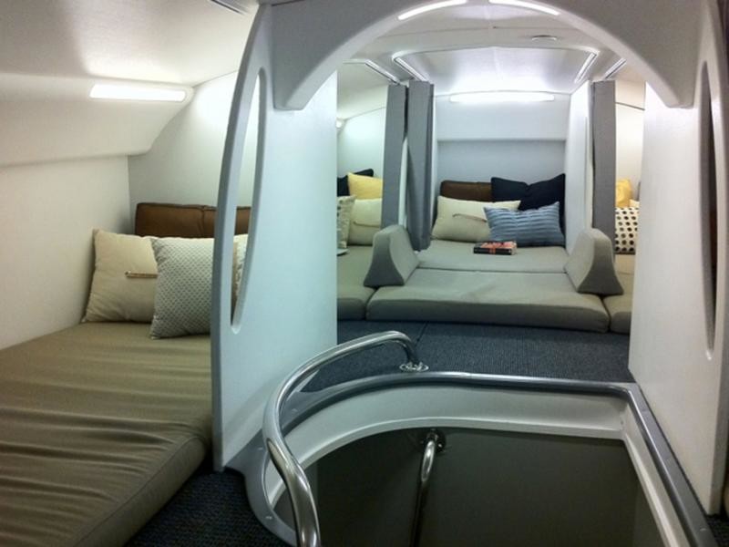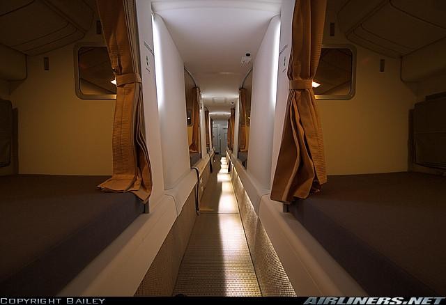 Огромные размеры самолета Airbus А380, рассчитанного на 853 пассажира, спальных мест требуется уже больше. Конструкторами было решено использовать высоту лайнера как можно рациональнее, поэтому они разместили 12 кроватей, по 3 одна над другой. Может это и не так комфортно, как на Boeing 787, но зато появляется возможность стоять в полный рост.