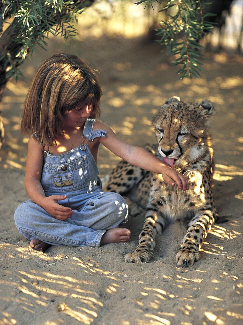 Детеныш гепарда дружелюбно облизывает Типпи руку.