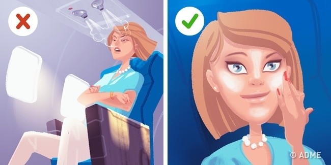 На борту самолета очень низкий уровень влажности, поэтому наша кожа страдает в первую очередь. Чтобы не испытывать дискомфорта, следуйте этим советам: