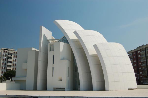 Эта постройка носит еще одно название – Церковь Милосердного Бога Отца. Ее отличительным признаком являются кривые стены, похожие на паруса, они предназначены чисто для технических целей – минимизировать тепловую нагрузку помещения.