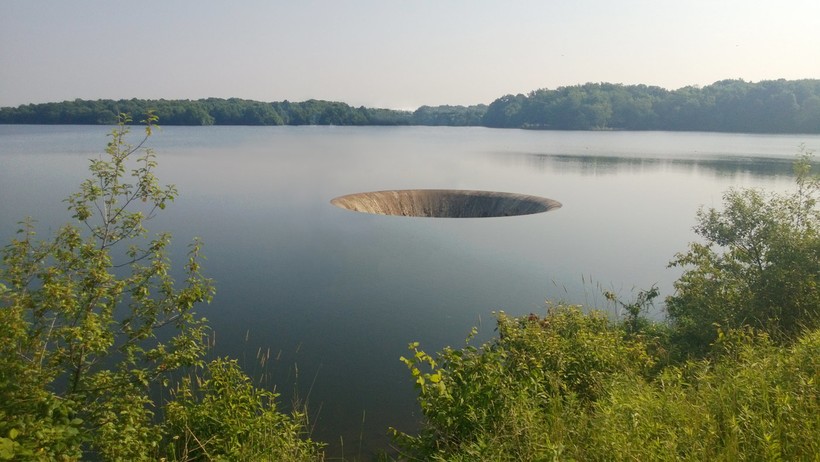 Эта искусственная воронка выполняет функцию клапана и сбрасывает лишнюю воду из резервуара плотины.