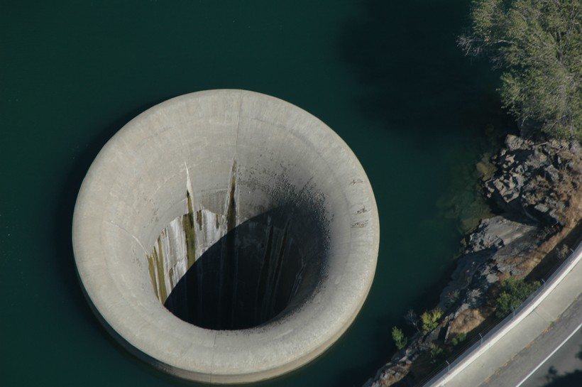 По факту это гигантская труба из бетона глубиной около 21 метра. По своей форме она напоминает перевернутый конус с основанием в 9 метров и верхушкой в 22 метра. Труба выводит воду с другой стороны плотины примерно на 200 метров, когда водохранилище переполнено водой.