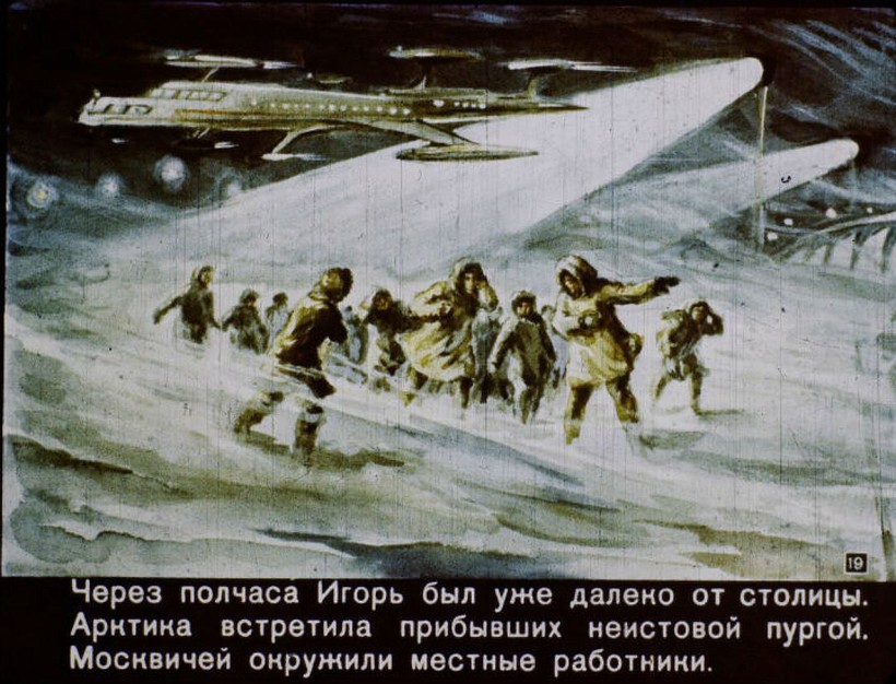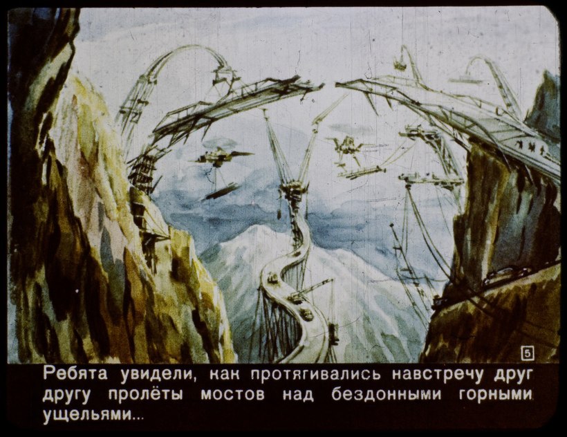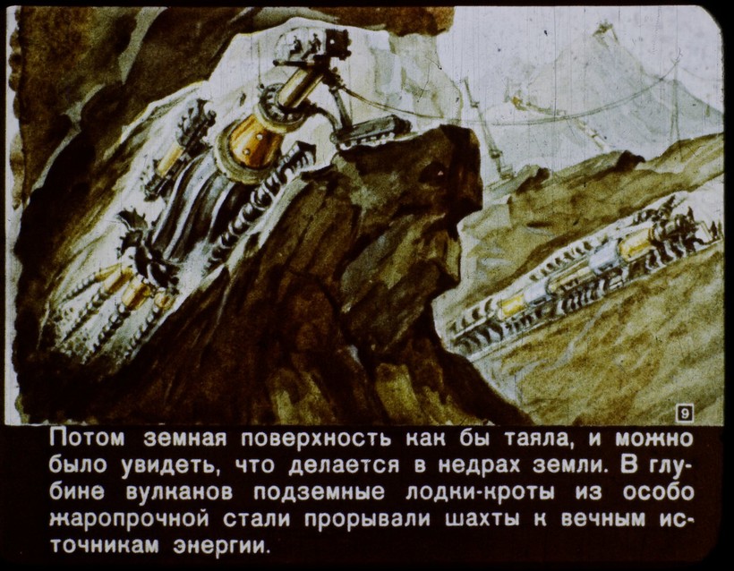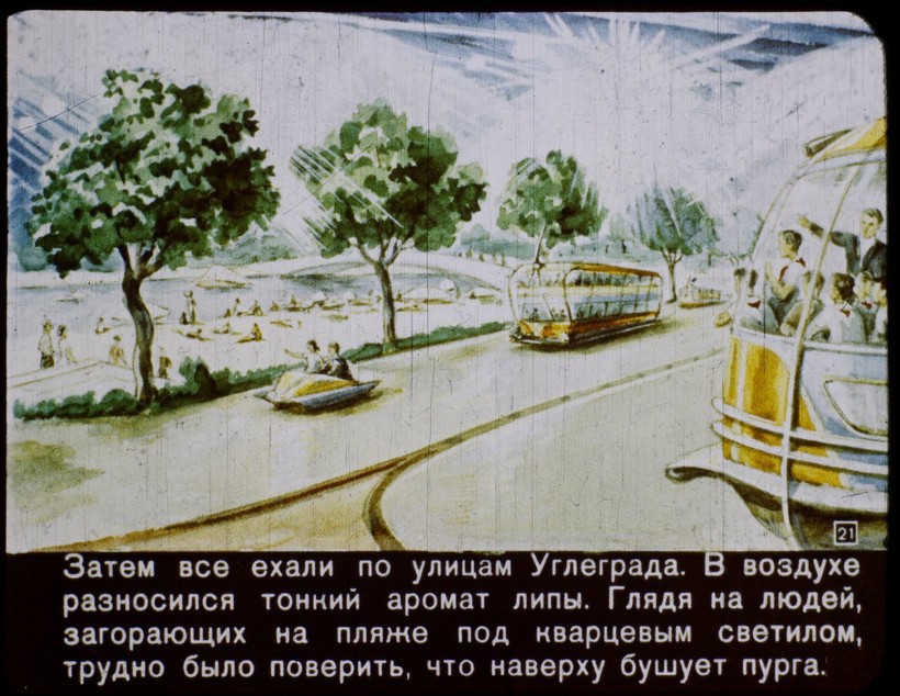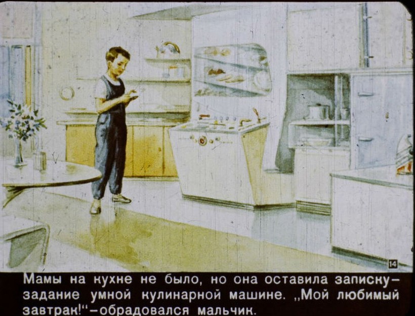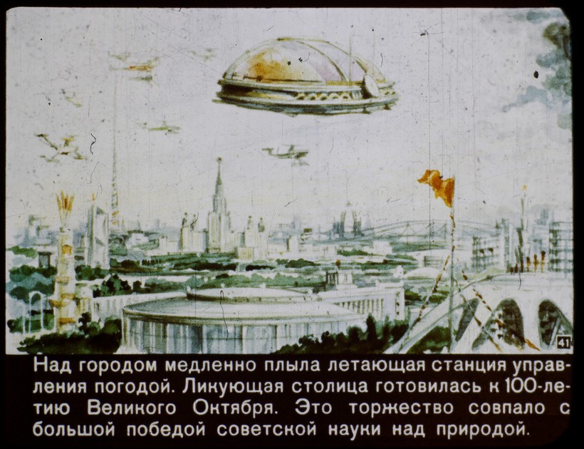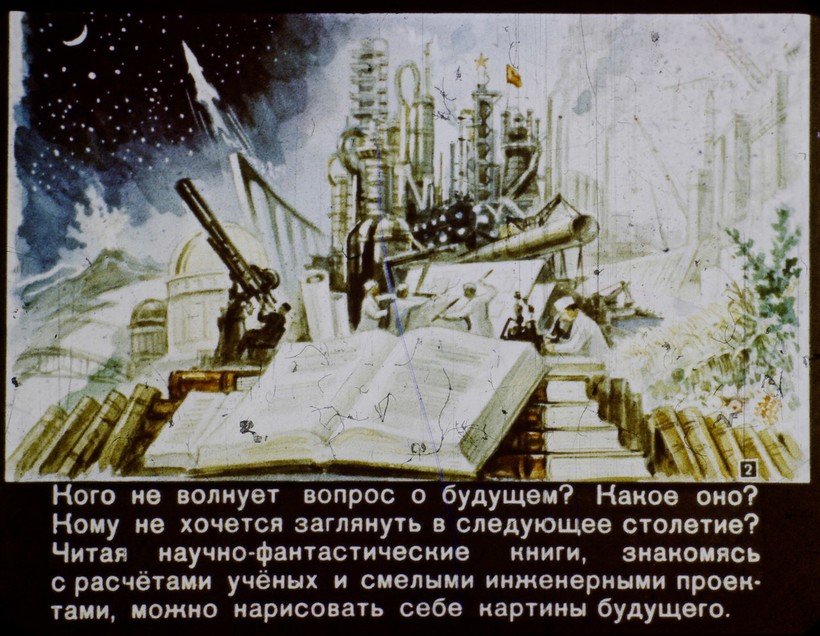 По мнению советской художественной студии «Диафильм», в будущем, которое для нас уже является современностью, человечество создает атомные поезда и посылает к двойной звезде Альфа Центавра фотонные ракеты, летающие метеостанции способны изменять климат, дети просыпаются от щелкающего их по носу будильника, а также множество других потрясающих идей, на которые необычайно любопытно взглянуть.