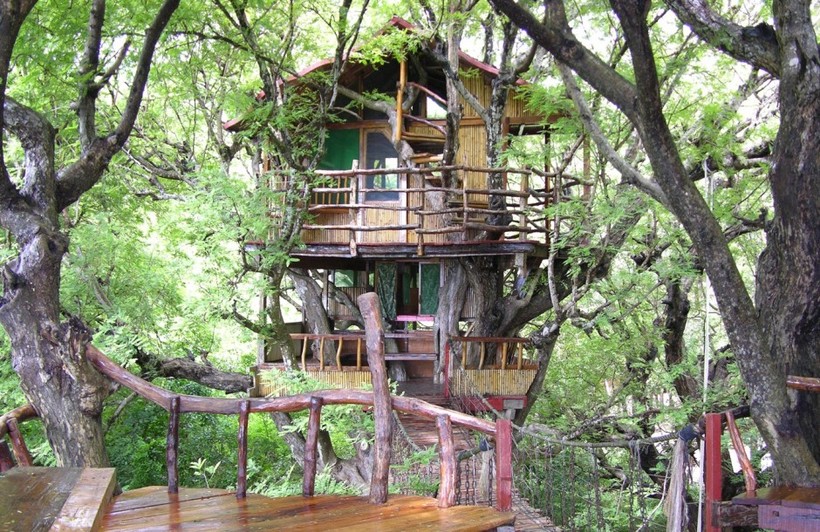Три больших дома на деревьях могут вместить до 20 человек. Неподалёку находится буддийский "тематический парк".