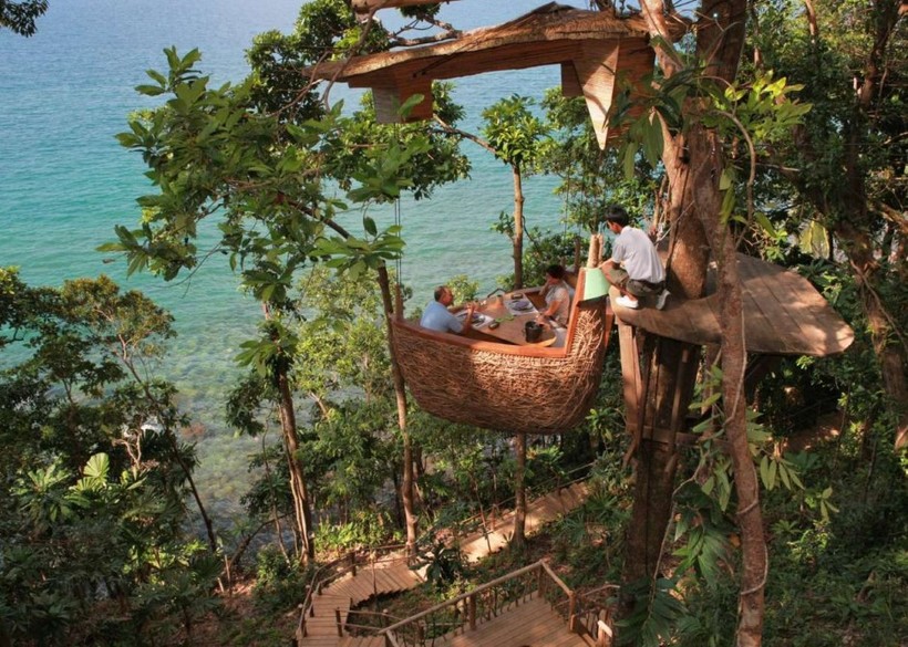 Это курорт на острове Куд, Таиланд, и он уникален своим рестораном. Вы размещаетесь в уютной "корзине" со столиком, которую подымают на высоту, а затем официант обслуживает вас с помощью канатной дороги.