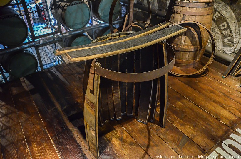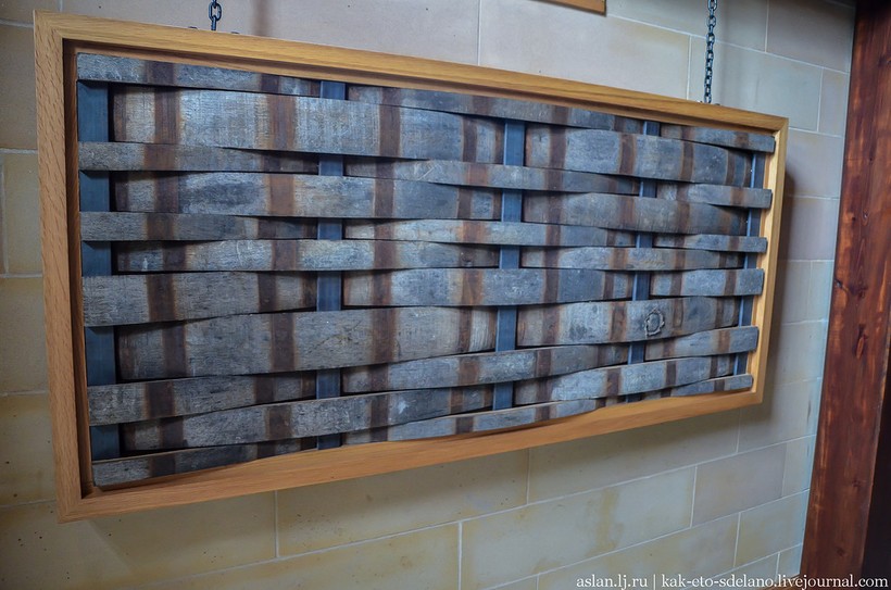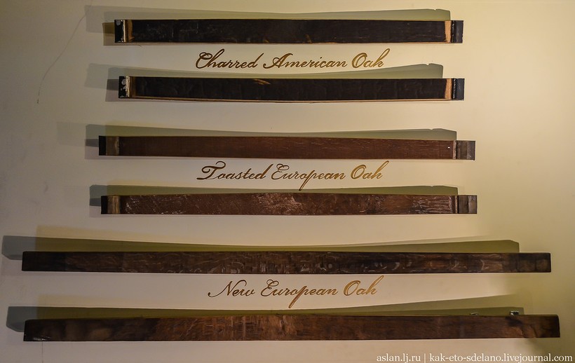 Поскольку таких бочек не хватает, применяют бочки как из американского дуба, ранее содержавшие бурбон или специально обработанные дешевым хересом, так и из европейских дубов. В музее на стене висят образцы досок для бочек. По ним можно понять, что бочки делают из досок различной толщины, а сами бочки имеют разный размер и объем.