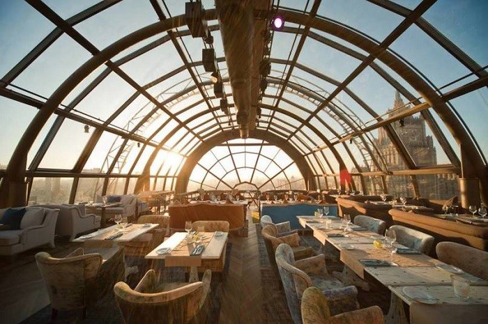 Роскошное заведение с красивым интерьером. Здесь из окон открывается вид на нашу столицу с высоты птичьего полета.